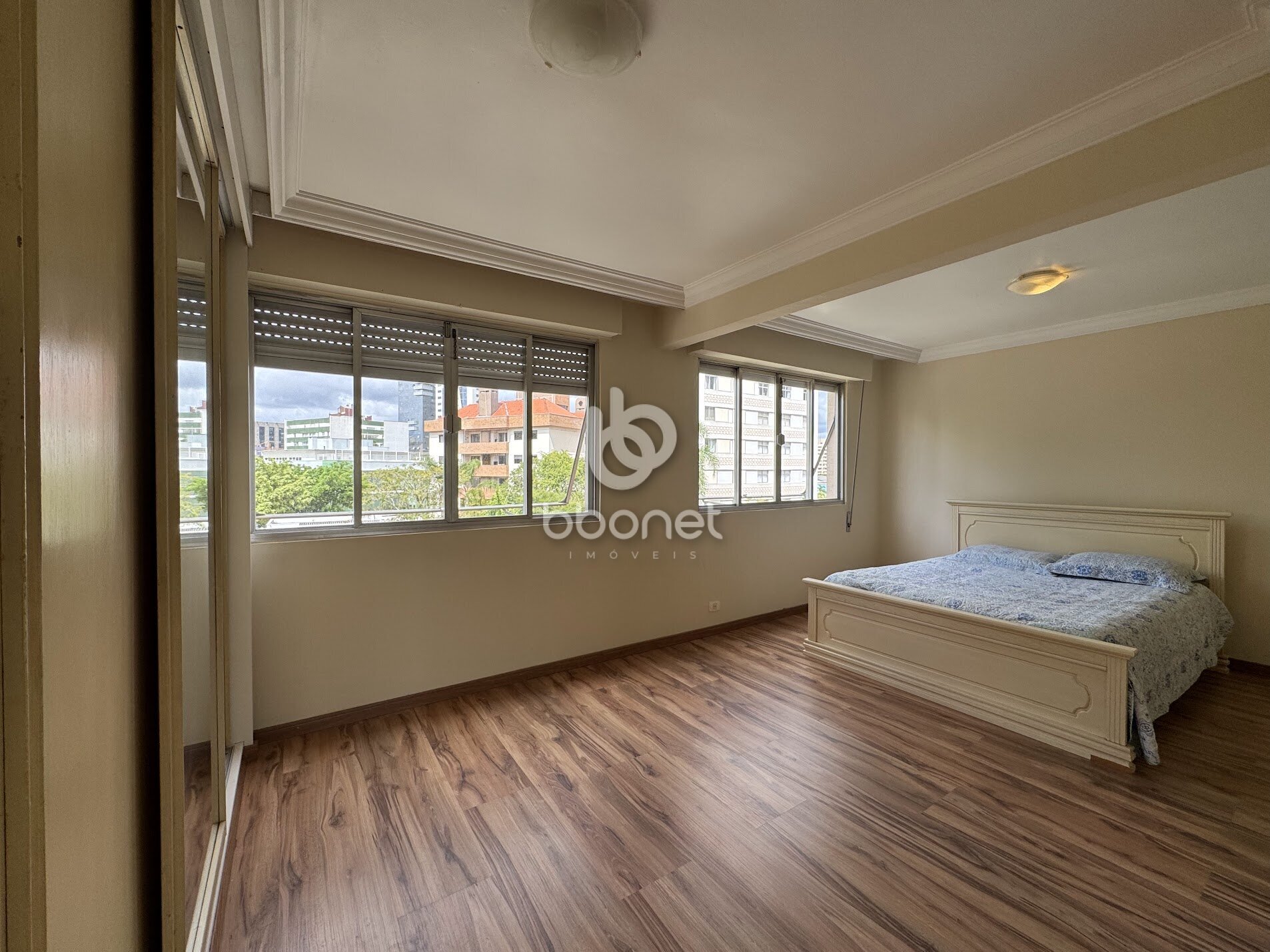A configuração de planta conta com três dormitórios sendo duas suítes que oferecem total privacidade e espaço. A cozinha é funcional e equipada com armários conectando-se a uma área de serviço completa com banheiro auxiliar e copa independente. O imóvel preserva a amplitude característica dos projetos da época garantindo ambientes muito maiores que os padrões atuais do mercado imobiliário curitibano.